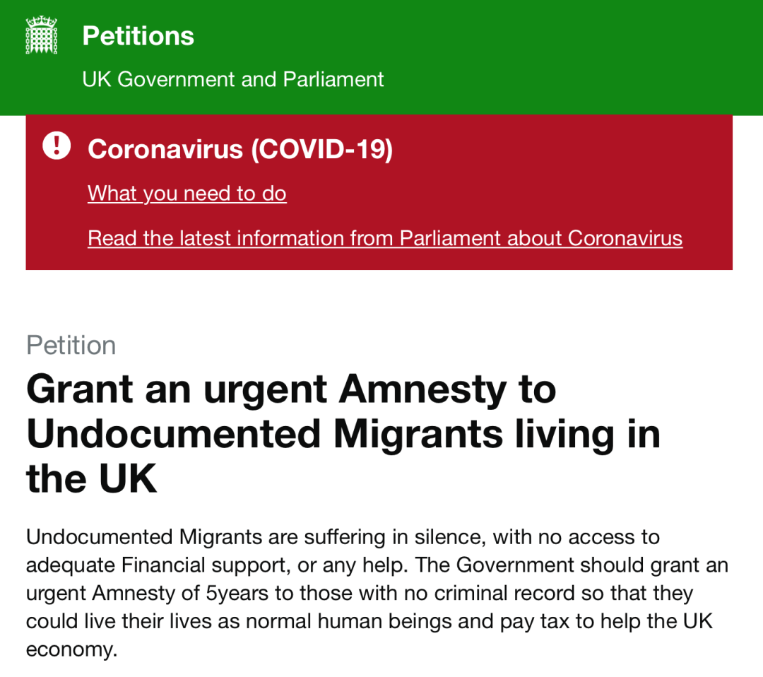 近日,一项请愿希望英国政府对居住在英国的非法移民给予紧急特赦,使其身份在英国合法化。
