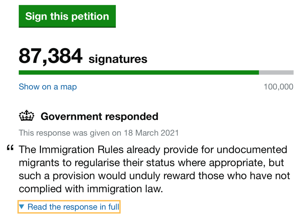 该请愿书希望英国政府立即大赦那些没有犯罪记录的非法移民,并给予他们英国公民身份,使他们留在英国获得基本人权,过上体面的生活,从而可以进一步给英国在经济上带来帮助。